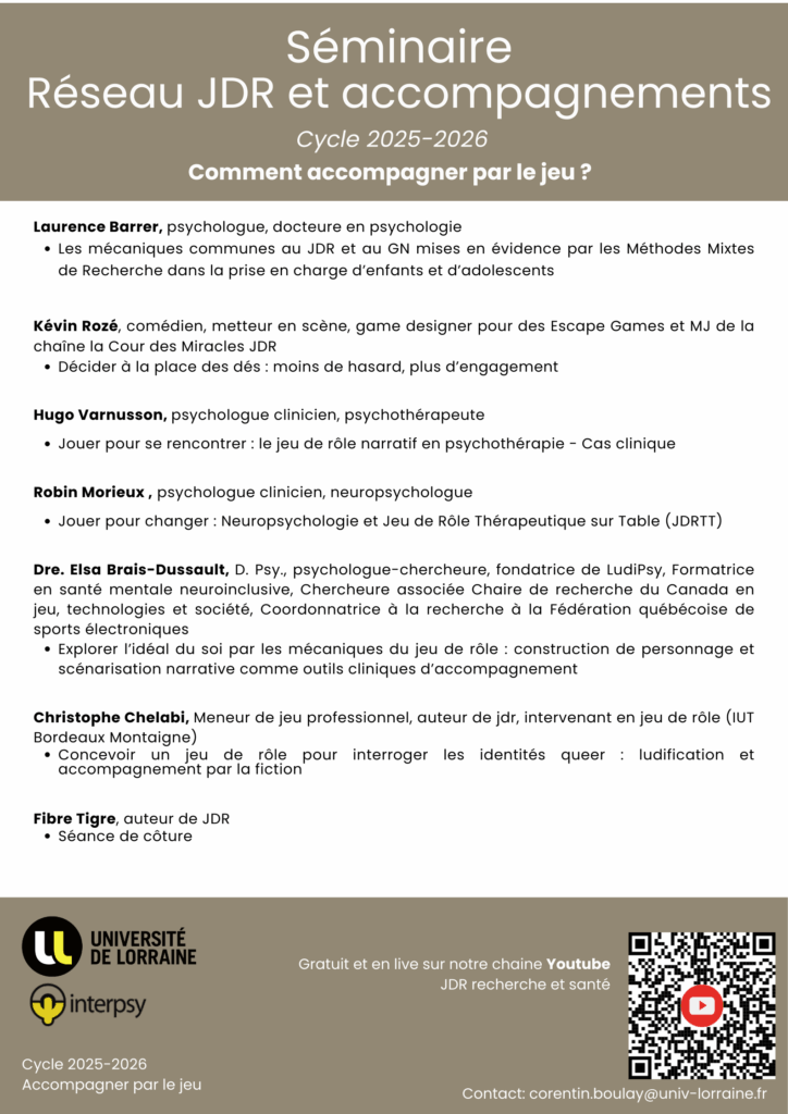 L’édition 2025-2026 du séminaire du Réseau JDR et Accompagnements visera à questionner les critères qui guident la construction d’un cadre d’intervention s’appuyant sur le JDR, et comment articuler le jeu, les objectifs de l’accompagnement et les particularités de la population rencontrée. Nous nous demandons comment le JDR s’adapte à l’accompagnement, et inversement comment les accompagnements évoluent au contact du jeu.